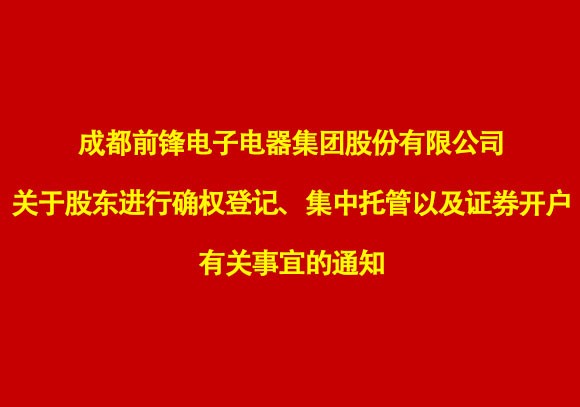 成都前鋒電子電器集團(tuán)股份有限公司關(guān)于股東進(jìn)行確權(quán)登記、集中托管以及證券開戶有關(guān)事宜的通知全體股東: 按照成都前鋒電子電器集團(tuán)股份
