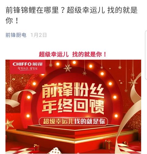 2019年1月2日,前鋒廚電官方微信平臺發(fā)布了前鋒錦鯉活動,活動機(jī)制非常簡單,消費者只需要轉(zhuǎn)發(fā)活動圖文,并填寫報名信息,便有機(jī)會成為此次活動的幸運錦鯉,一人獨享含熱水器、吸油煙機(jī)、燃?xì)庠?、嵌入式洗碗機(jī)、電蒸汽爐、電烤箱、空氣凈化器、凈水器、暖風(fēng)機(jī)9大品類價值37576元的前鋒廚電全線新品大禮包。