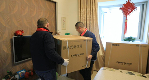 前鋒工作人員將前鋒廚電全線新品大禮包送至幸運兒家里